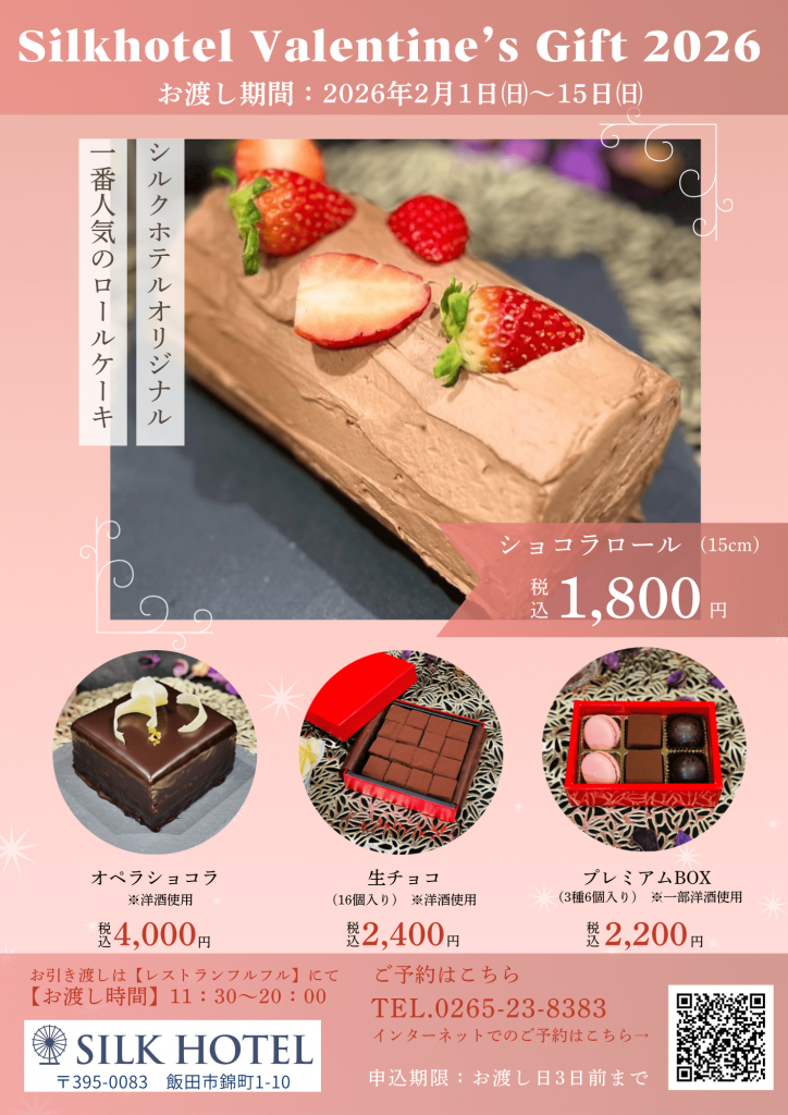 Silkhotel Valentine’s Giftのご案内 販売期間: 2/1(日)~2/15(日) ご注文 :お渡し日の3日前正午まで お渡し :シルクホテル フルフル お渡し時間:11:30~20:00 ご予約制です ご注文はチラシのQRコード又はお電話にて承ります。